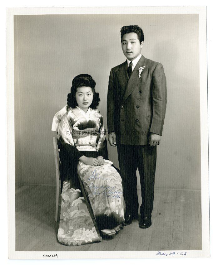 Interior photograph of a man and woman, likely on the occasion of their wedding/marriage. The man is standing, wearing a nice suit. The woman is in a chair next to him in traditional Japanese dress (kimono). Written on front of photo in blue pen is: "Shi -- Always, Joe + Helen Okabe" and written on the bottom white border of photo is: "May 29, '43." A label beneath the photo identifies them as "Joe & Helen Okabe."