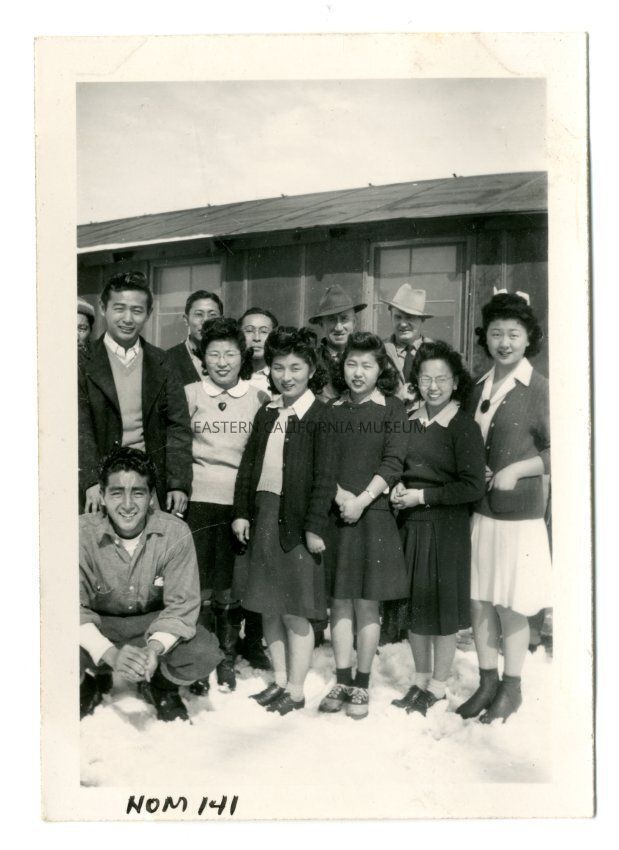 Exterior photograph of 12 people standing in the snow in front of a barracks building. Label beneath photo identifies the group as "Public Works Dept." Arthur Sandridge, Senior Engineer at Manzanar, is in back row of photo.Photograph Details