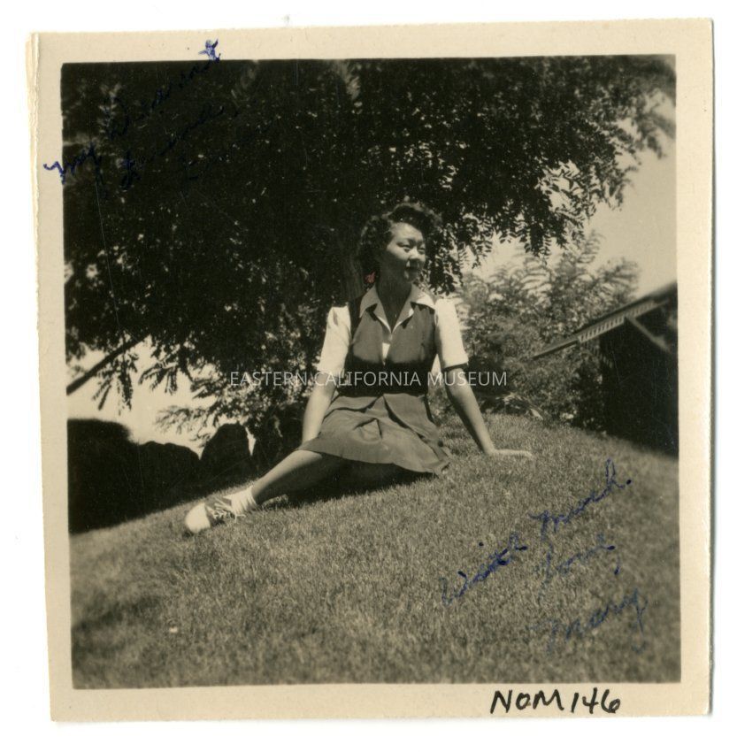 Exterior photograph of Mary Kageyama Nomura sitting on grassy hill in front of a tree in Block 12 garden. Written in blue ink on lower right corner of photo is "With Much Love, Mary" and written in upper left corner of photo in blue ink is "My Dearest Friend."