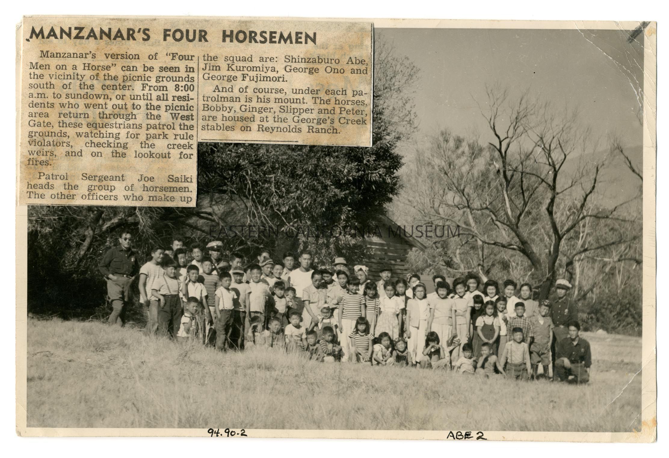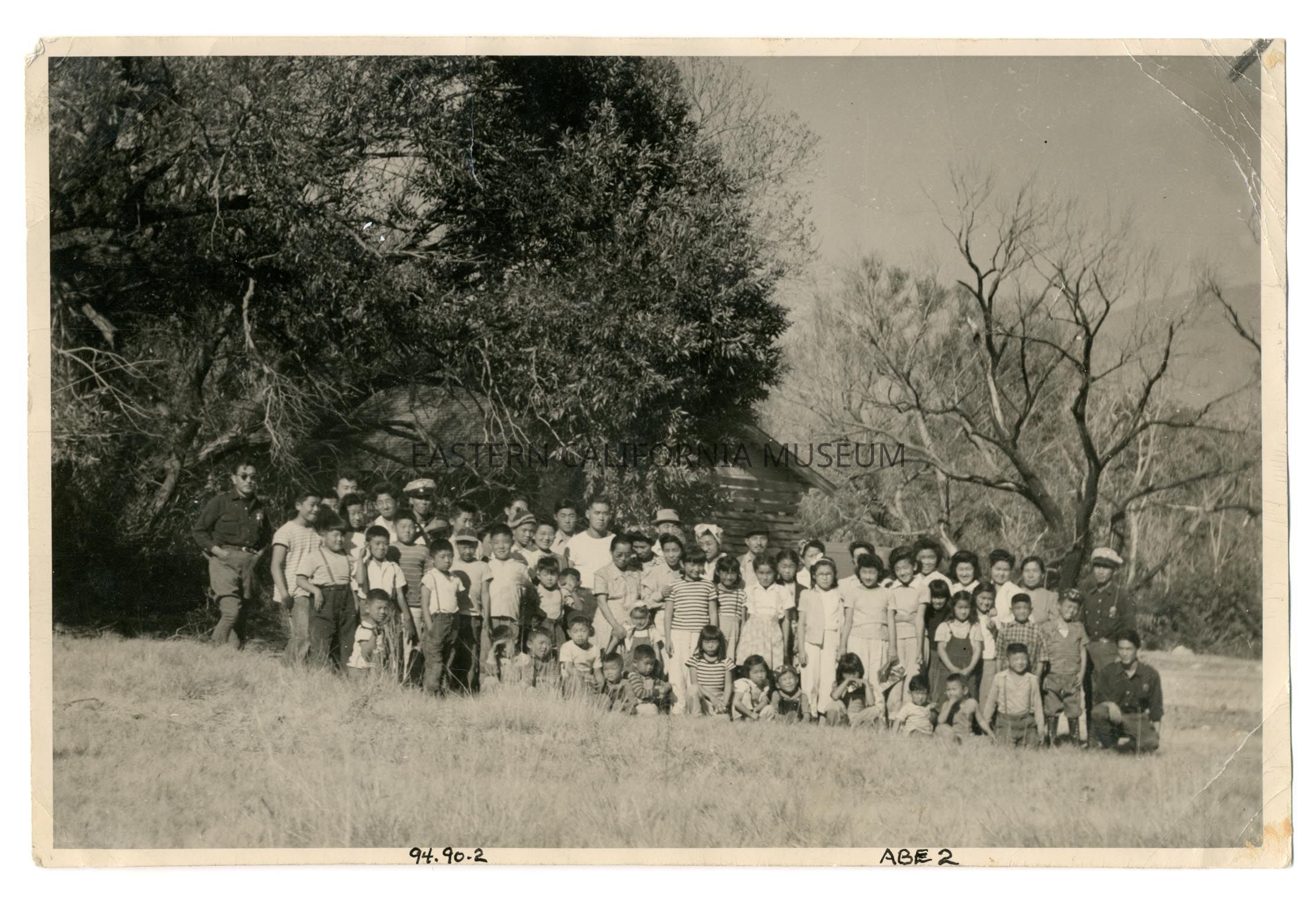 Exterior photograph of an estimated 60 people, at least half of them children. The people are in a grassy area in front of a wooden building with trees on either side. On back of photo is written: "S. Abe, Mounted Police, Reynald's Ranch, Aug. 1943." Attached to the front upper left corner of the photo is an undated newspaper clipping with the title "Manzanar's Four Horsemen" (1994.80.31n).