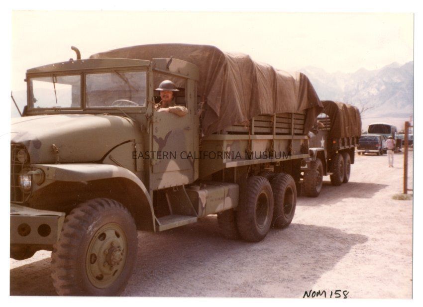 Color photograph of two green army style 3 axle trucks with canvas tops at Manzanar with mountains in the background. In the front truck is a man sitting in drivers position wearing a uniform and metal helmet. Photo is from the NHK TV Tokyo Production filmed on site at Manzanar in April 1984.Photograph Details