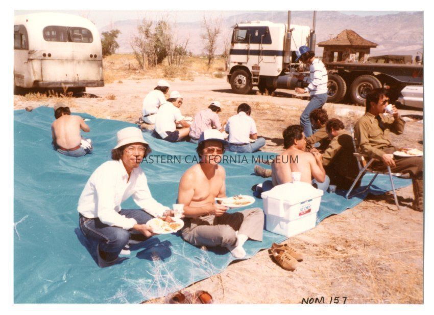 Color photograph of a group of twelve people eating lunch near the front entrance to Manzanar. People are standing, sitting on blue tarp spread out on ground, with one sitting in a folding lawn chair. In background are a bus, a flatbed truck, the top of a jeep, one of the entrance building guard stations, and the Inyo Mountains. Photo is from the NHK TV Tokyo Production filmed on site at Manzanar in April 1984.Photograph Details