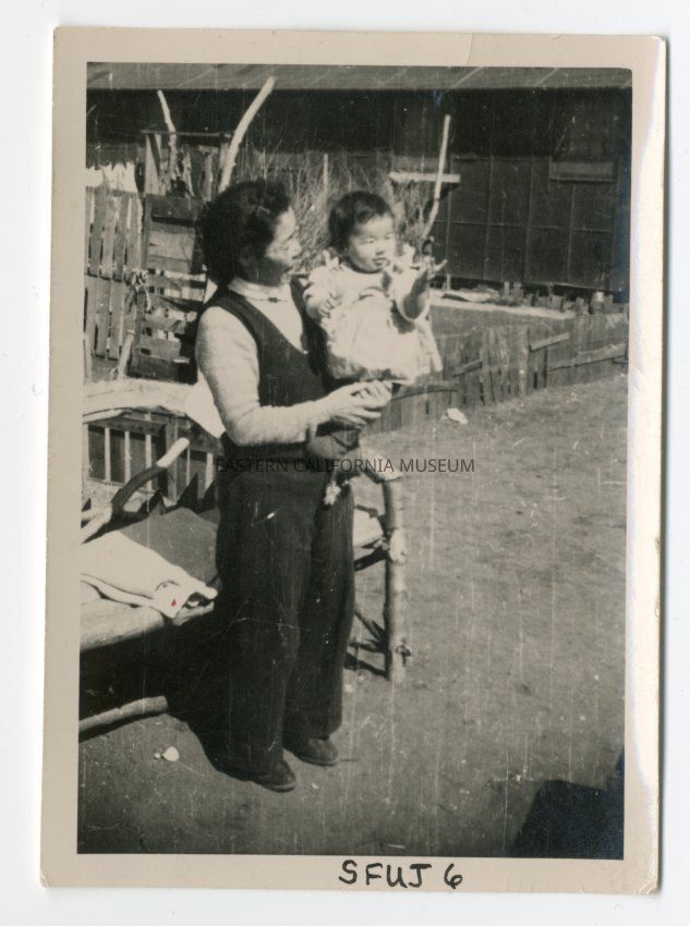 Exterior photograph of an unidentified woman holding a young child. She is standing in front of a bench, and behind the bench is a barrack building and a small area fenced with scrap lumber.Photograph Details