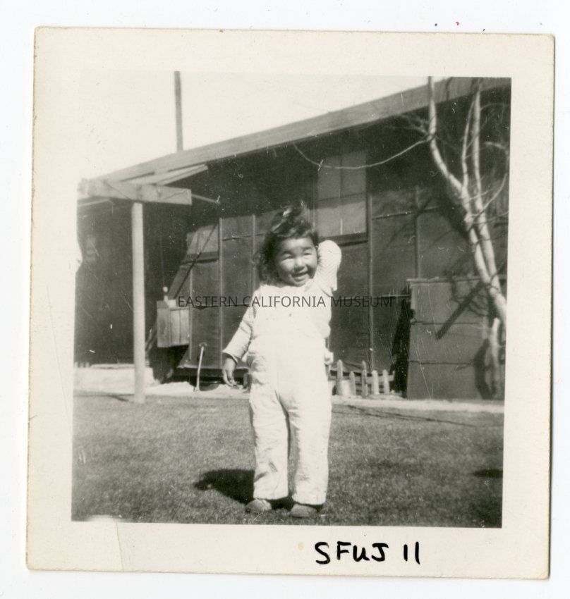 Exterior photograph of unidentified young girl standing on grass in front of a barracks apartment.Photograph Details