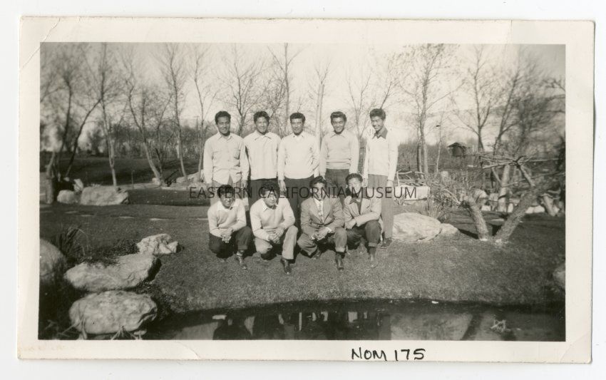 Exterior photograph of nine young men in two rows on a grassy hill in Merritt Park. They are members of the Manzaknights. Shiro Nomura is standing in the back row third from left.Photograph Details