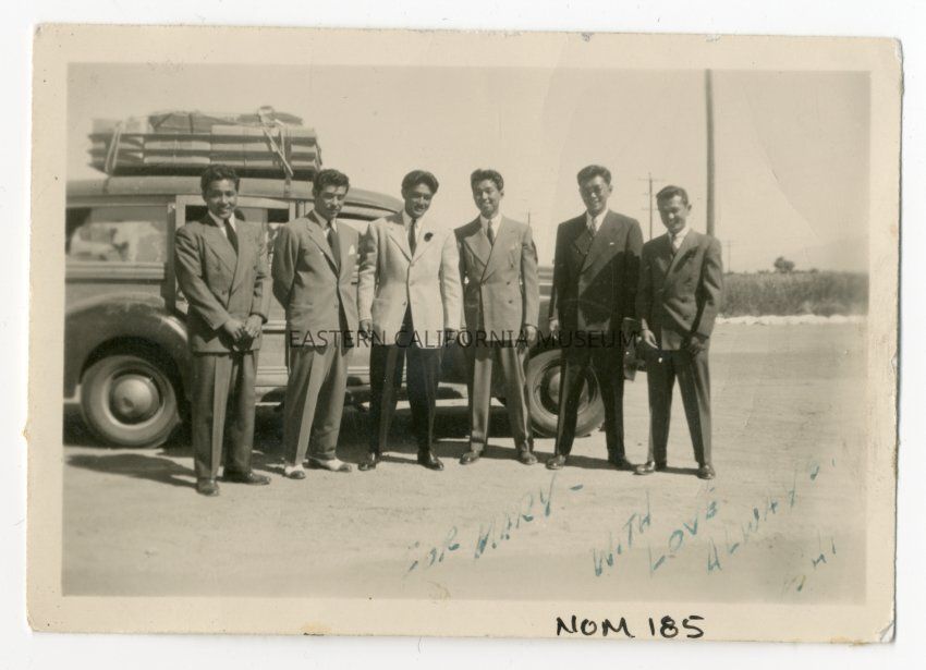 Exterior photograph of six young men standing in front of the station wagon used by the WRA to transport incarcerees into and out of Manzanar. The men are wearing coats and ties, and the label below the photo is: "Furlough '43 Denver, Colo." Written on the photo in the lower right corner is: "For Mary - With Love Always, Shi." Shi is second from left in the photo. The men are members of the Manzaknights.Collection