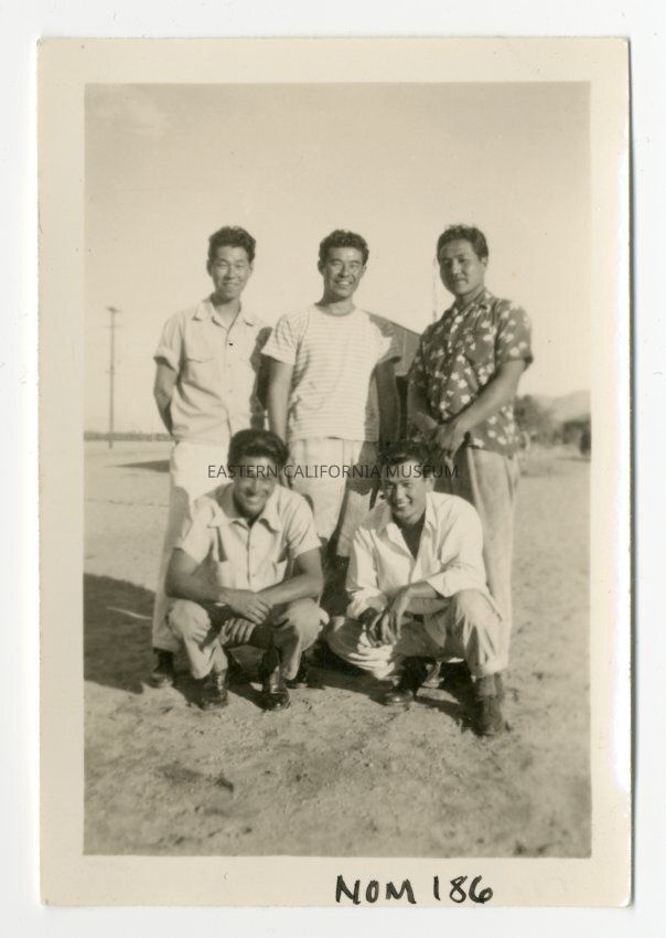 Exterior photograph of five members of the Manzaknights in two rows, with Shiro Nomura in the middle of the back row. A label under the photo identifies the men as: "Kow, Nob, Terry, Shi, Joe."Photograph Details