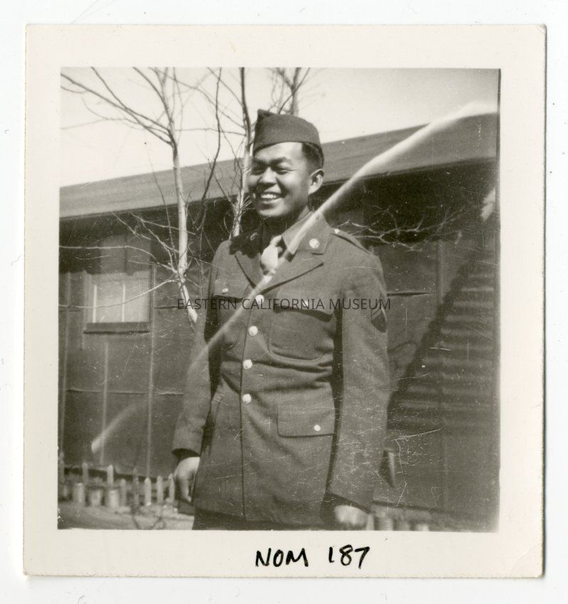 Exterior photograph of young man in army uniform standing in front of a barracks building. Label underneath photo is: "1st Volunteer U. S. Army" and another label identifies the soldier as: "Yo Ishida 1943." Yo Ishida was an advisor to the Manzaknights.Photograph Details
