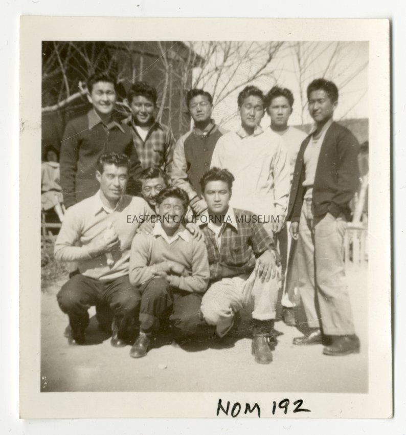 Exterior photograph of ten young men in two rows. The men in the front row are squatting and kneeling on the ground. Shiro Nomura is on the far left in the front row. Behind the men are the bare branches of a tree and a barracks building. These men are members of the Manzaknights.Photograph Details
