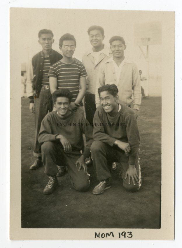 Exterior photograph of six young men in three rows with the front row kneeling. They are on the edge of a basketball court with the backboard visible behind them. These men are members of the Manzaknights.Photograph Details
