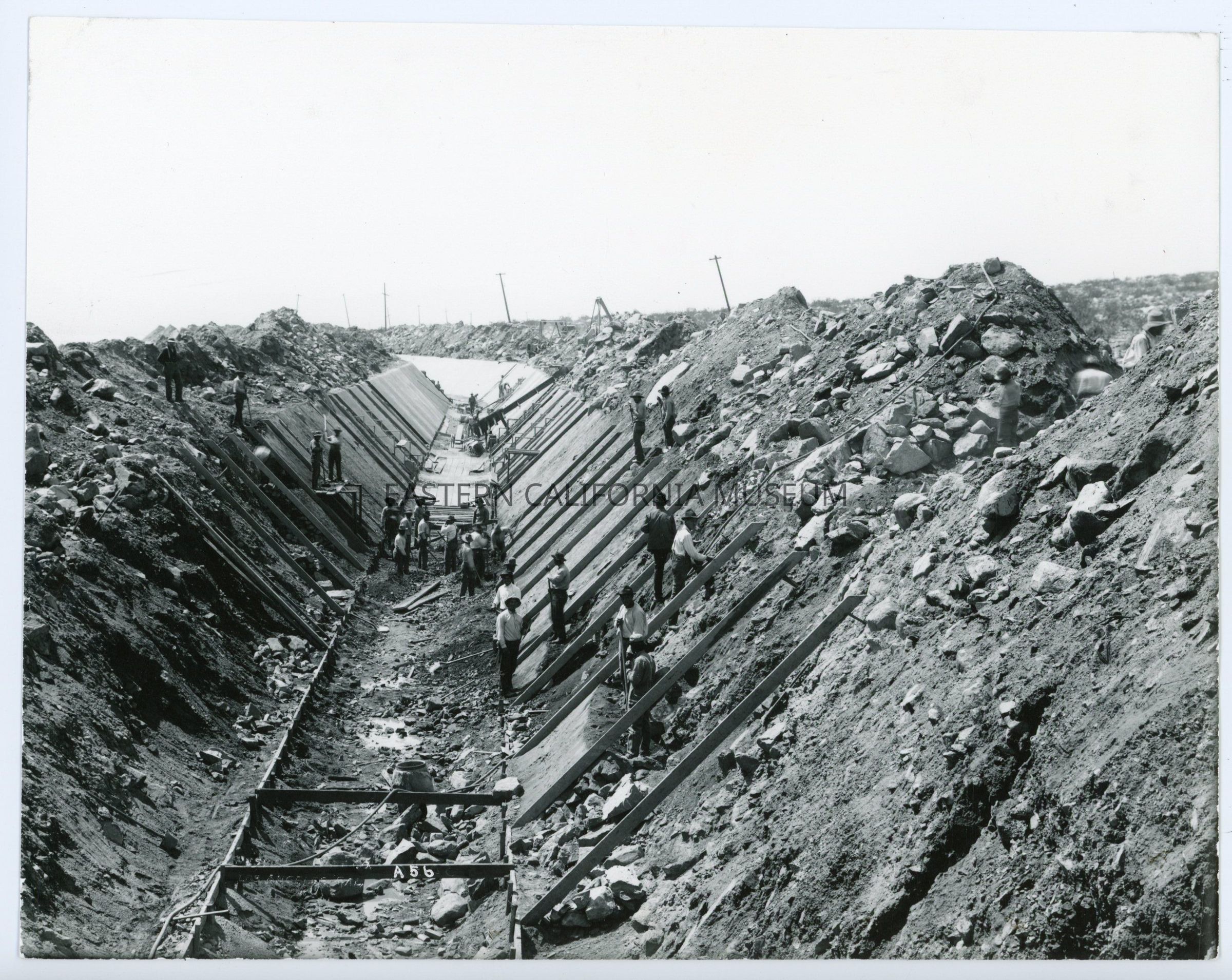 Workmen shown concrete-lining a section of the Los Angeles River Aqueduct west of Owens Lake.