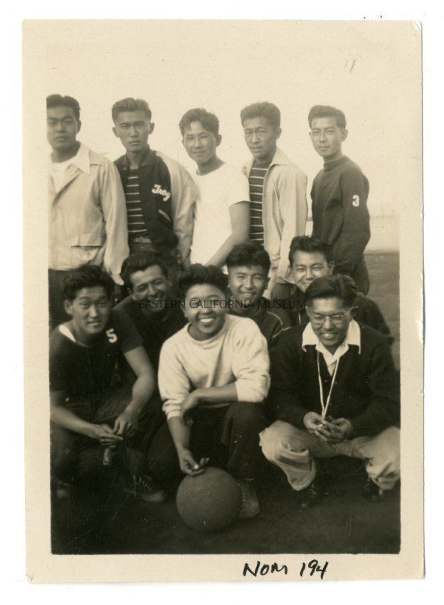 Exterior photograph of eleven young men in three rows with the front two rows kneeling and squatting. Two of them have numbers on their shirts, and the man in the center of the front row has his hand on top of a basketball. These men are members of the Manzaknights.Photograph Details