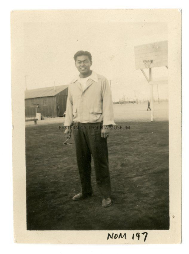 Exterior photograph of a young man standing an a basketball court with the backboard visible behind him. The man has been identified as Yo Ishida, co-advisor of the Manzaknights.Photograph Details