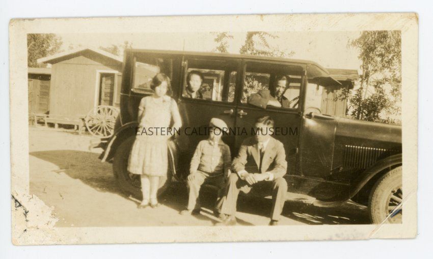 Five people and car. This photo was found in a group of 16 other photos, and the people are thought to be members of the Nomura family.