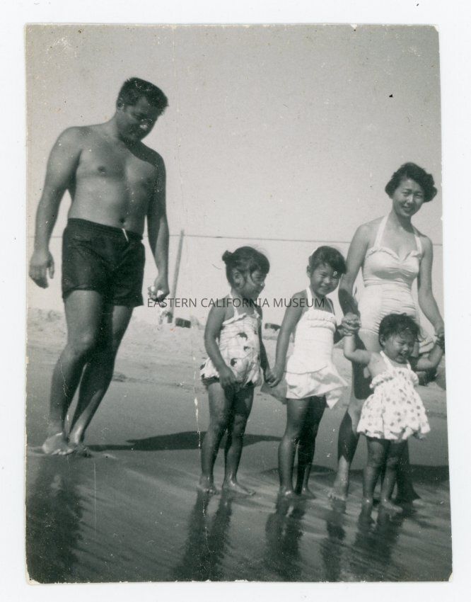 Photo of family of five at beach. This photo was found in a group of 16 other photos, and the people are thought to be members of the Nomura family.Collection