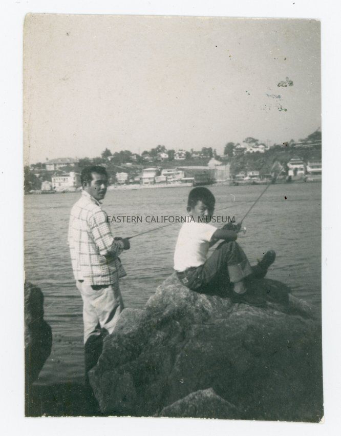 Photo of two men fishing. This photo was found in a group of 16 other photos, and the people are thought to be members of the Nomura family.Collection
