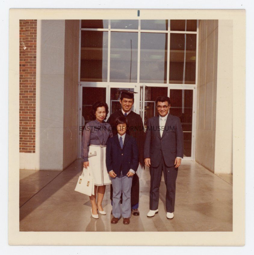 Four people at a graduation ceremony. This photo was found in a group of 16 other photos, and the people are thought to be members of the Nomura family.Collection