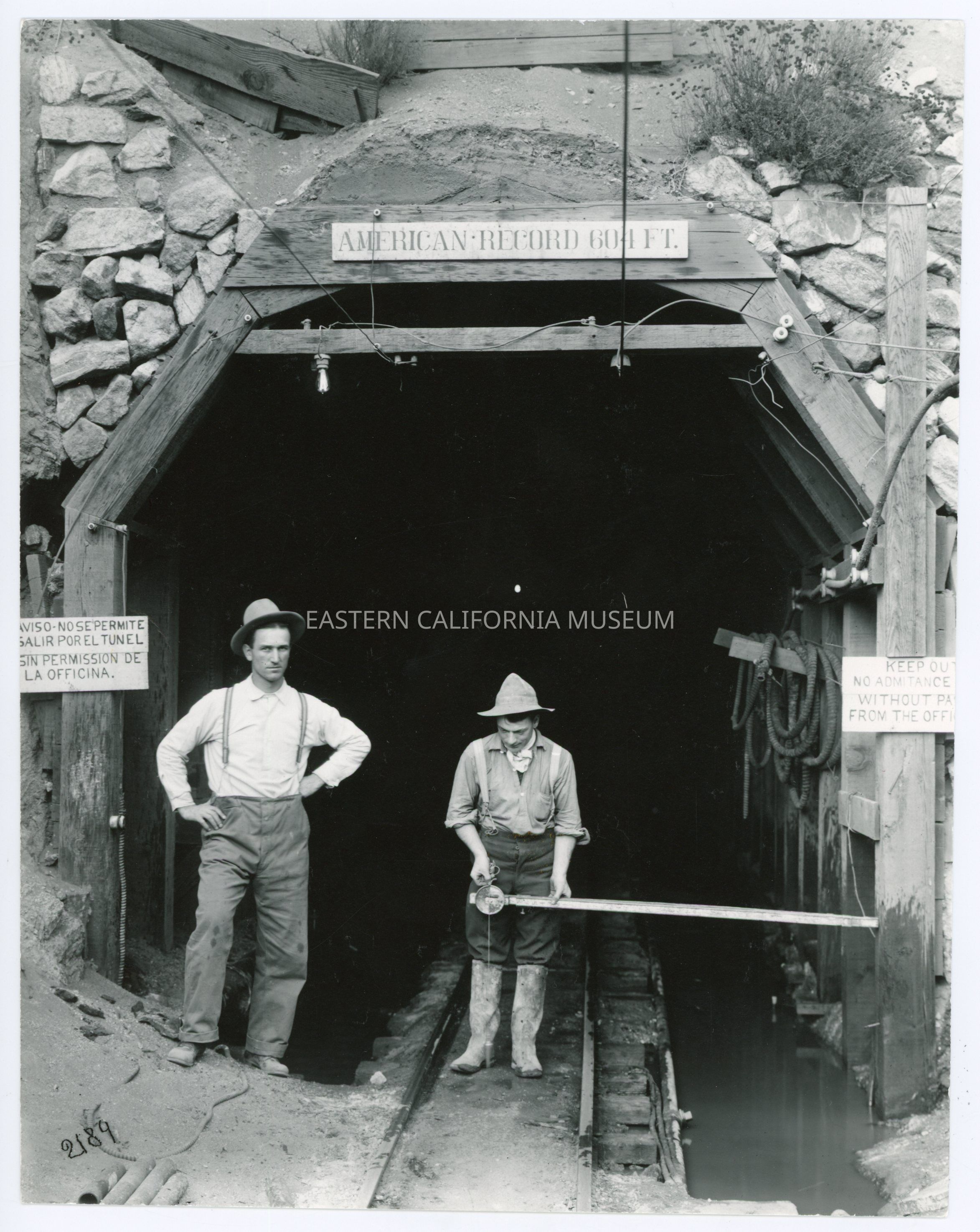 Sign over tunnel entrance says "American Record 604 ft." A sign in Spanish on the left side of the tunnel says "Aviso no se permite salir por el tunnel sin permission de la officina." A sign in English on the right side of the tunnel says, "Keep out. No admittance without permission from the office."