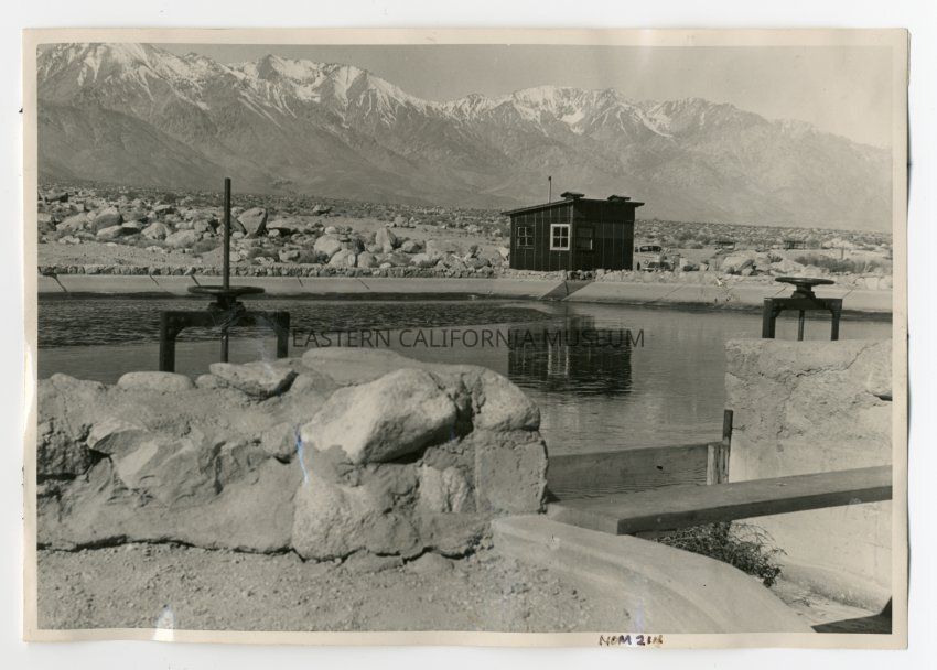 Exterior photograph of the Manzanar reservoir after completion and full of water. At the bottom is the overflow outlet to the reservoir. Behind the reservoir is a small building covered in tarpaper with an automobile parked next to it. In the background are the Sierra Nevada.