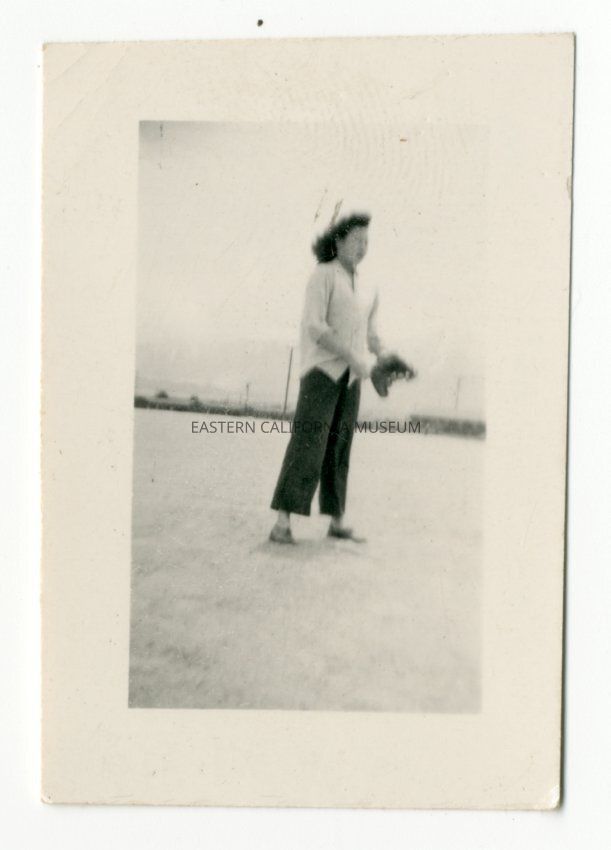 Exterior photograph of a woman standing on dirt field wearing a softball mitt. From collection of photos of the "Dusty Chicks" Softball Champions 1942.Photograph Details
