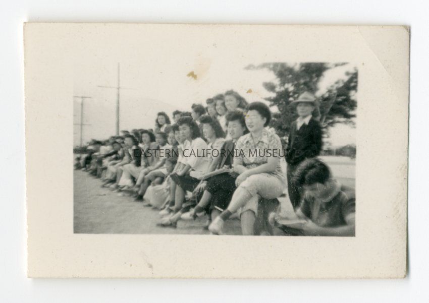 Exterior photograph of two rows of people, mostly women, with front row sitting and back row standing. From collection of photos of the "Dusty Chicks" Softball Champions 1942.Photograph Details