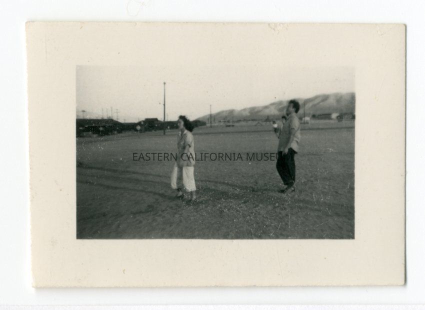 Exterior photograph of woman standing on base as part of softball game. A man is standing a few feet behind her, and there are barracks buildings in the background. From collection of photos of the "Dusty Chicks" Softball Champions 1942.Photograph Details