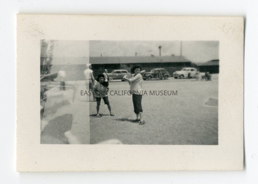 Exterior photograph of a woman standing on dirt field at home plate holding a softball bat. Behind home plate is a woman wearing a softball mitt in position to catch a pitch. Behind the softball players are three automobiles and a barracks building. From collection of photos of the "Dusty Chicks" Softball Champions 1942.Photograph Details