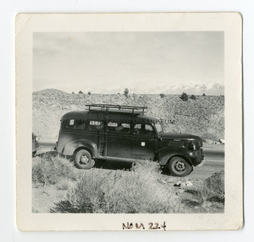 Exterior photograph of Dodge vehicle called "The Maria" used by Nan Zischank to transport Manzanar incarcerees to and from Manzanar and places like Reno and Mojave where they had access to trains. The vehicle had four rows of seats to carry numerous passengers.