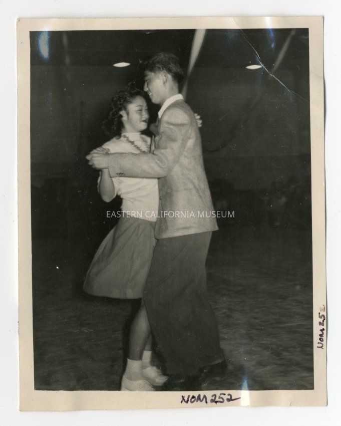 Interior photo of the "Prize Waltz" as part of the December 1, 1944, "Oklahoma" Dance in the Manzanar Auditorium. Photo shows Waltz contest winners Rosie Moruki and George Shiba dancing the waltz. This event was listed in the Nov. 25, 1944 issue of the "Manzanar Free Press."