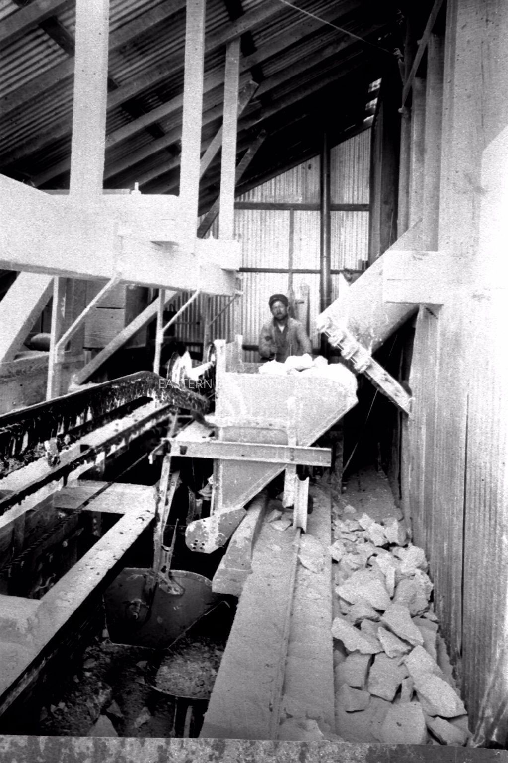 B & W digital scan of Tram Buckets being loaded with Limestone at LADWP's South Quarry to eventually be transported to the Monolith Cement Plant.