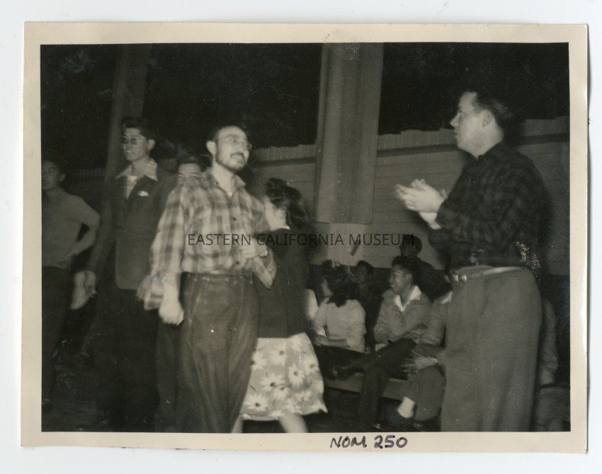 Interior photo of Fudge Fujimoto and Louis Frizzell at the December 1, 1944, "Oklahoma" Dance in the Manzanar Auditorium. Behind the two men are several men and women standing and sitting on benches. This event was listed in the Nov. 25, 1944 issue of the "Manzanar Free Press."