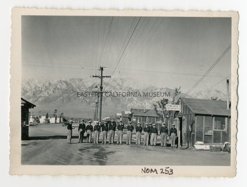 Exterior photograph of fourteen police officers in a line facing east at the door of the Manzanar Police Department. All are wearing Manzanar Police uniforms and caps. The photo looks west toward Mt. Williamson with barracks buildings on the right and administration buildings on the left. At the far left edge of the photo is the edge of the interior Sentry Post at the Entrance to Manzanar.Photograph Details