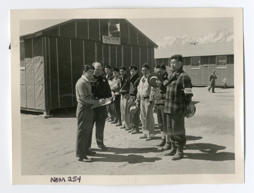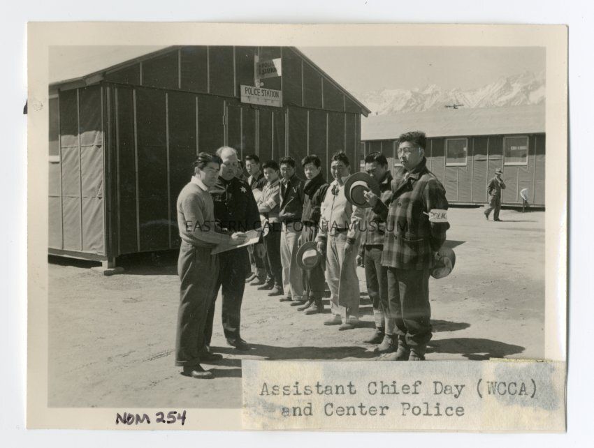 Exterior photograph of a row eight young men in civilian clothing wearing armbands that say "Police" standing across from two men, one of whom is wearing a uniform shirt and badge. A typed label attached to bottom of photo says "Assistant Chief Day (WCCA) and Center Police." Behind the men is a barracks building with a sign "Police Station."Photograph Details