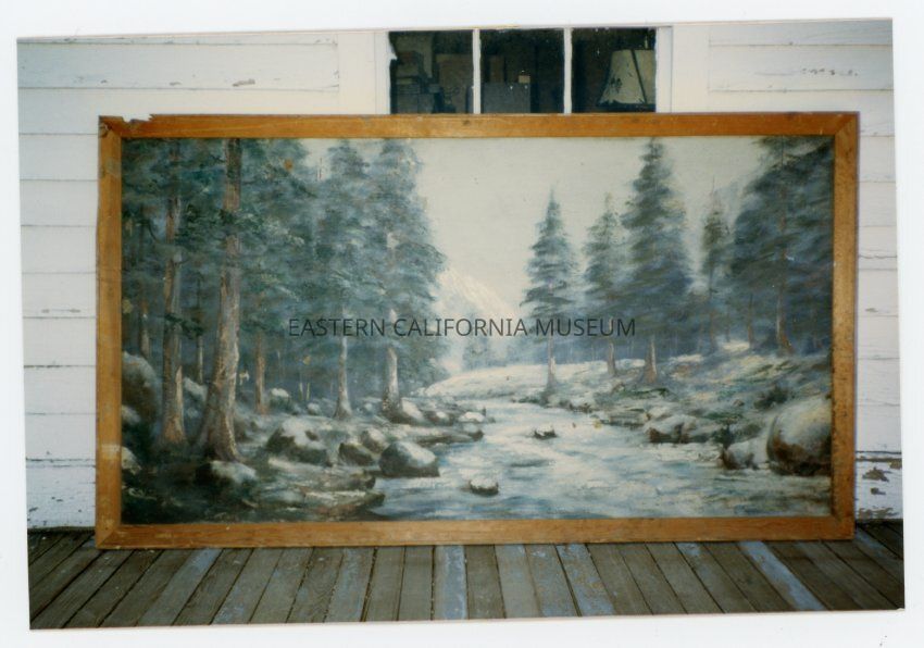 Color photo of a mural of trees and river. This mural was painted at Manzanar War Relocation Center, and now is in the collections of the Eastern California Museum (1980.131.2).