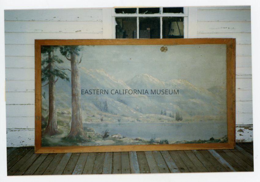 Color photo of a mural of mountains and lake. This mural was painted at Manzanar War Relocation Center, and now is in the collections of the Eastern California Museum (1980.131.1).
