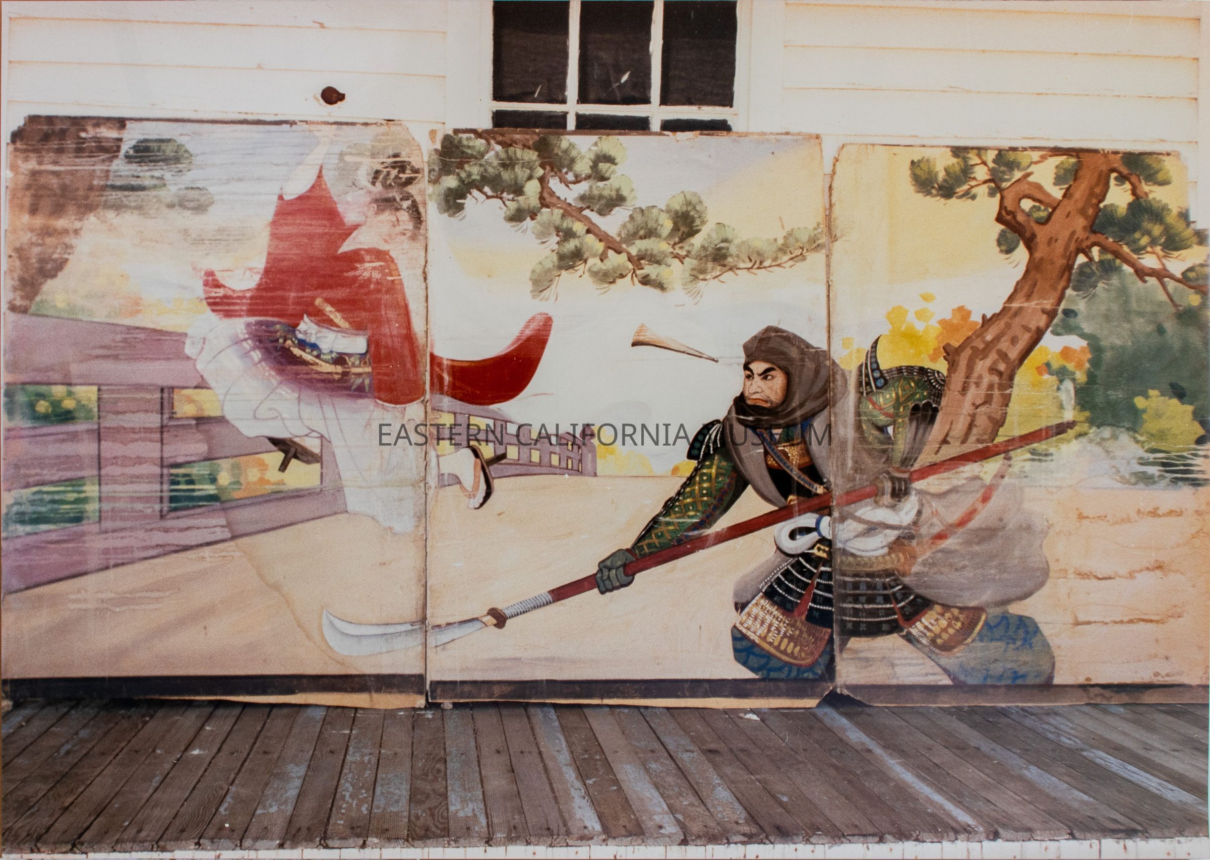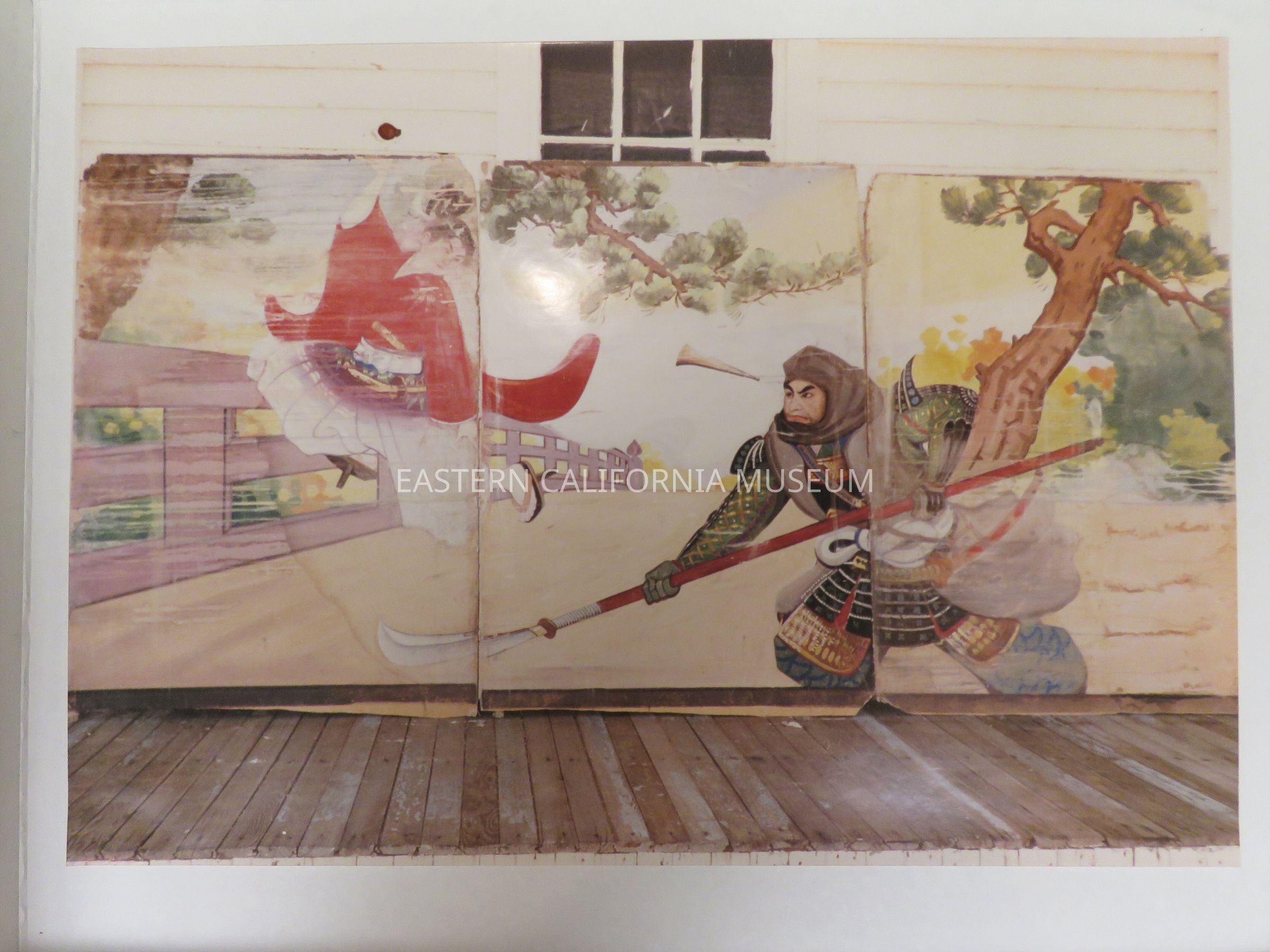 Enlarged color photo of the Ushiwakamaru and Benkei triptych mural painted by Masasuke Henry Kumano of Block 19. It was painted on the Block 16 mess hall wall and now is in the collections of the Eastern California Museum (2020.2.6-8).
