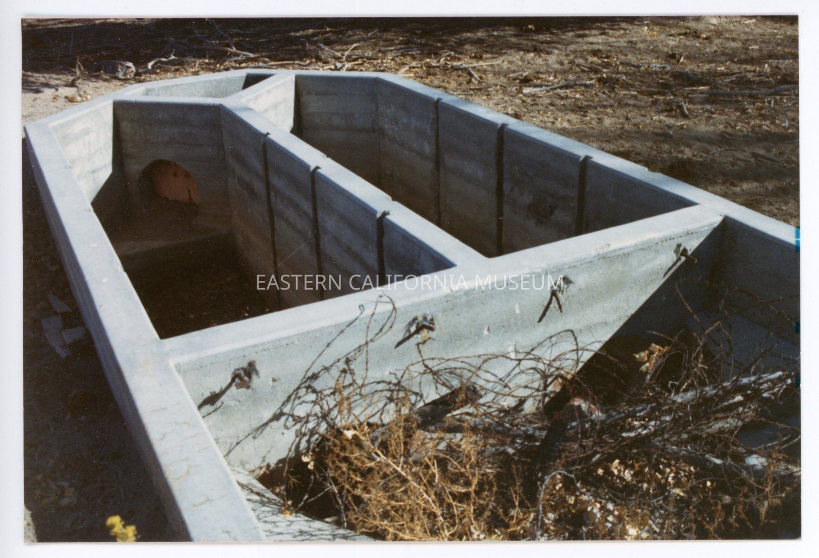 Color photo of a concrete basin in the ground divided into four parts. There is dried sagebrush or tumbleweeds in one part. A label with it says, "Pump houses."