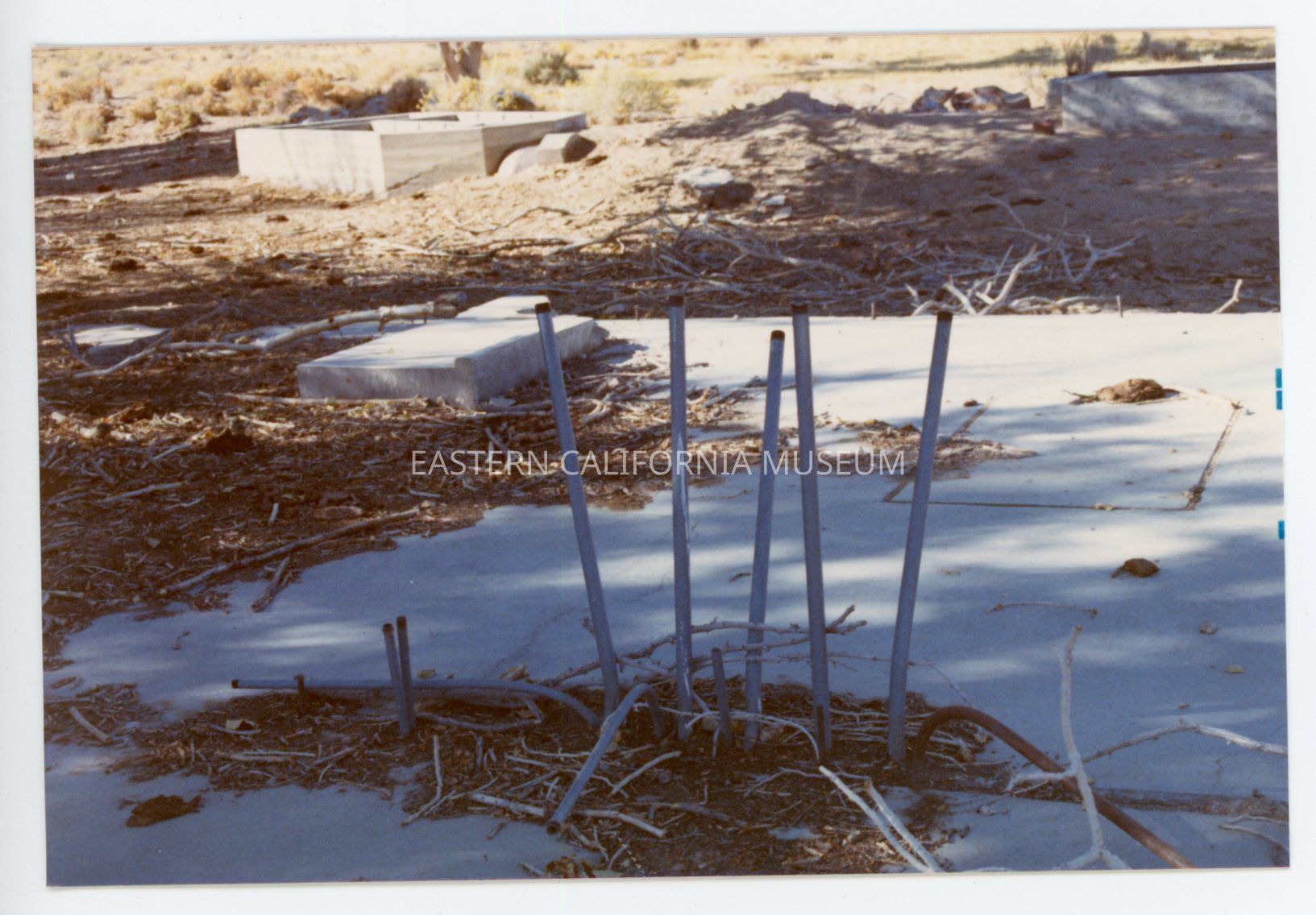 Color photo of concrete foundations with several metal pipes sticking up out of them. A label with it says, "Control house foundation (entrance)."