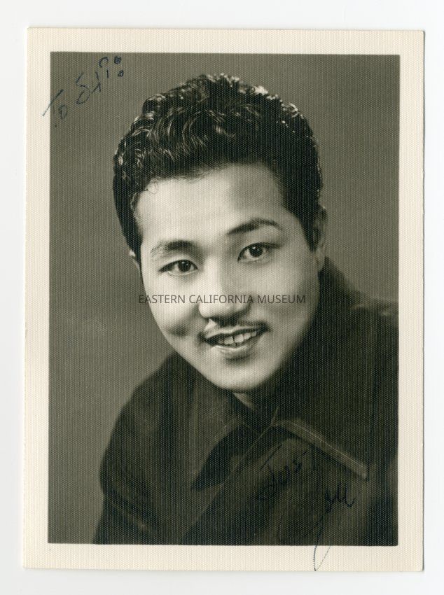 Studio portrait of Joe Okabe. On the face of the photograph is written: "To Shi: Just Joe." Label below photo identifies Joe Okabe "Knights," for Manzaknights.