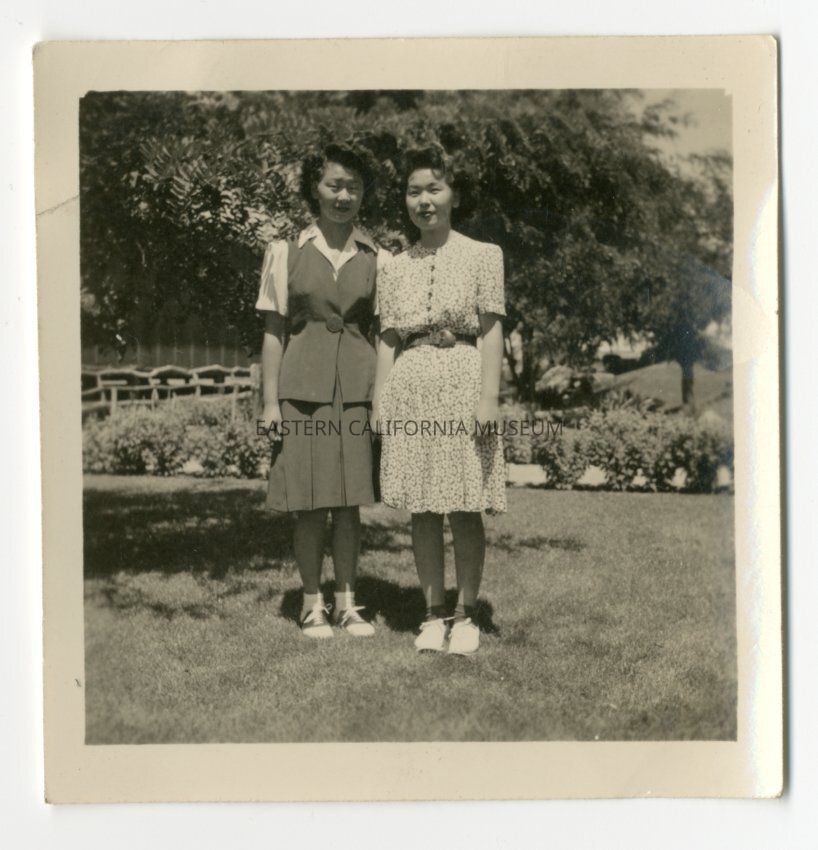 Exterior photograph of two young women standing on grass in front of some shrubs and trees. Woman on left might be Mary Kageyama (Nomura).Collection