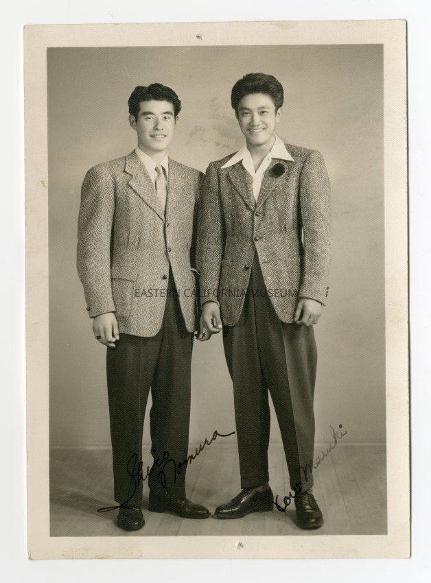 Studio portrait of Shi Nomura, left, and Kow Maruki, right, standing side-by-side wearing dress pants and jackets in April 1943.
