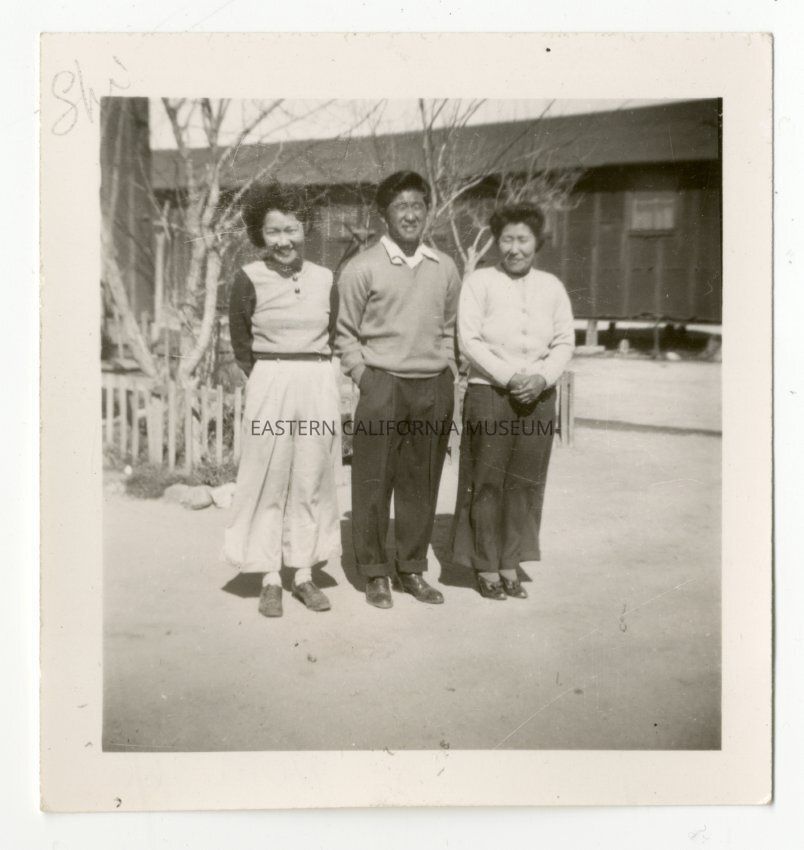 From Louie Sakamoto's photos. Exterior photo of three people standing in front of a barrack. Someone has written "Shi" along the top edge of photo.Photograph Details