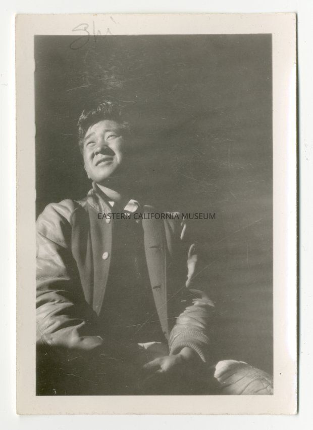 From Louie Sakamoto's photos. Photo of a man wearing what looks like a letterman jacket. Possibly a member of the Manzaknights? Someone has written "Shi" along the top edge of photo.Photograph Details