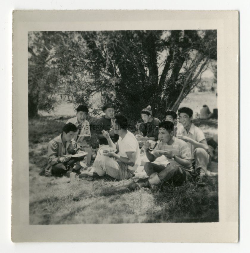 From Genzo Nishida's pics. Exterior photograph of 8 young men sitting on ground having a picnic in the South Park directly south of Manzanar.Photograph Details