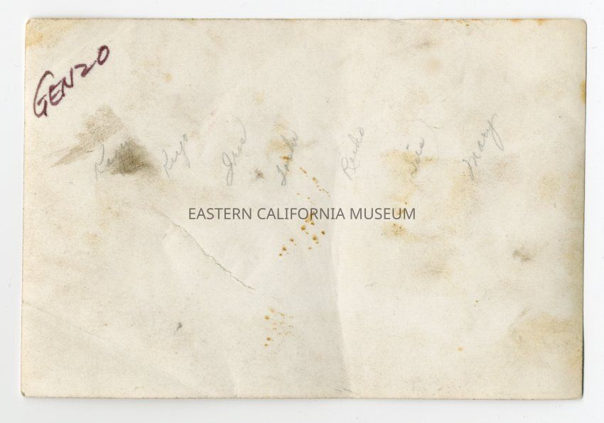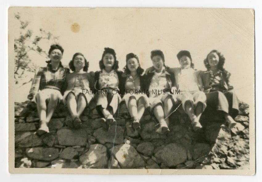 From Genzo Nishida's pics. Exterior photograph of 7 young women sitting on a rock wall in the South Park area directly south of Manzanar. Mary Kageyama (Nomura) is on the far left in photo. They are identified on the reverse: Kagy, Kyo, Jess, Tashi, Reiko, Sois, Mary.Photograph Details