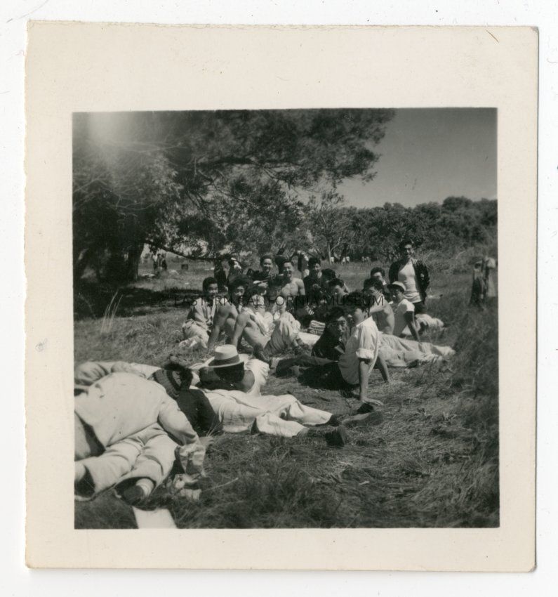 From Genzo Nishida's pics. Exterior photograph of 22 (estimated) young men and women sitting and lying on the ground as part of a picnic event in South Park area south of Manzanar.Photograph Details