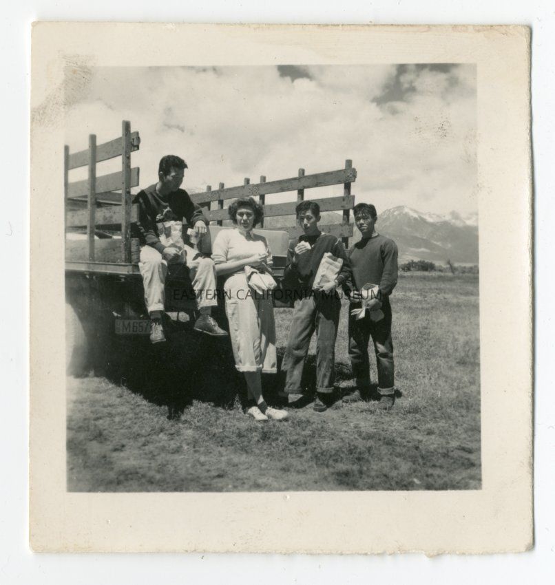 From Genzo Nishida's pics. Exterior photograph of three men and one woman at the back of a flatbed truck with the Sierra in the background. This is part of a picnic event in South Park area south of Manzanar.Photograph Details