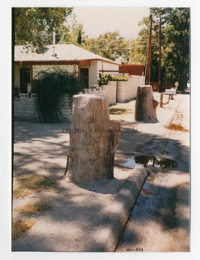 Color photo of the two concrete stumps (concrete patterned like wood) that were removed from the entrance of Manzanar (after the site closed) and installed at a house on the corner of Market St. and Valley View St. in Independence.Photograph Details