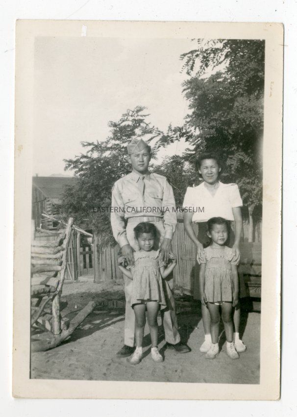 From Louie Sakamoto's photos. Exterior photograph of Louie Sakamoto standing with a woman and two young girls with a barracks building and a fenced area behind them. Louie Sakamoto is wearing an army uniform.Photograph Details
