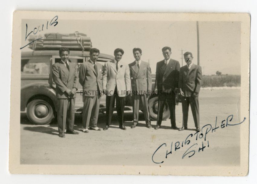 From Louie Sakamoto's photos. Exterior photo of six men standing in front of a loaded-up vehicle. They are all wearing suits (dress jacket and slacks). Written on front of photo is, "Louie, Christopher Shi."Collection